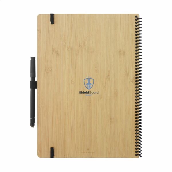 Bambook Classic Hardcover uitwisbaar notitieboek in A4-formaat. Met stevige bamboe hardcover en 20 vel/40 pagina's uitwisbaar, gelinieerd papier voor het maken van aantekeningen. Schrijf met de speciale marker op de whiteboard pagina's, scan je aantekeningen met de Bambook app en wis je pagina's, met een vochtig doekje, schoon voor hergebruik. Met wire-o-binding, penlus en sluitelastiek. Inclusief pen met gum. Het notitieboek is met de hand gemaakt. Made in Holland.