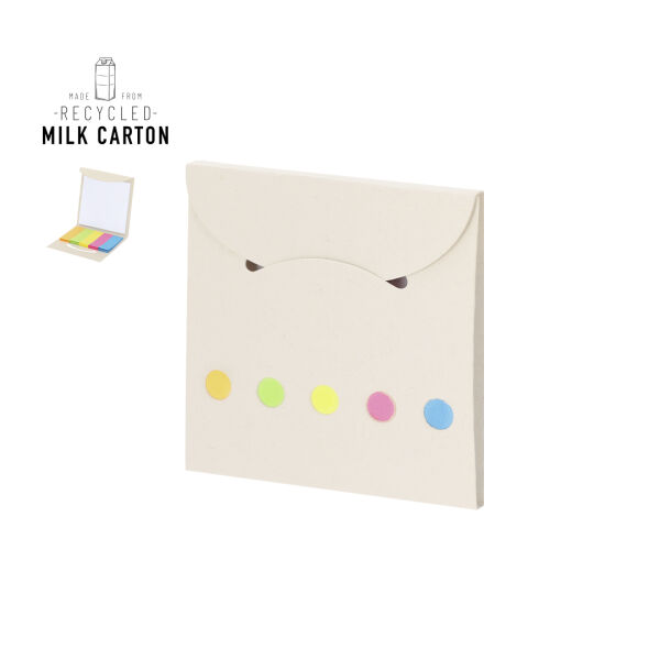 Notitieblok met covers gemaakt van gerecycleerde melkpakken. Met zachte omslagen en 50 vierkante zelfklevende notities en 125 mini zelfklevende notiti…